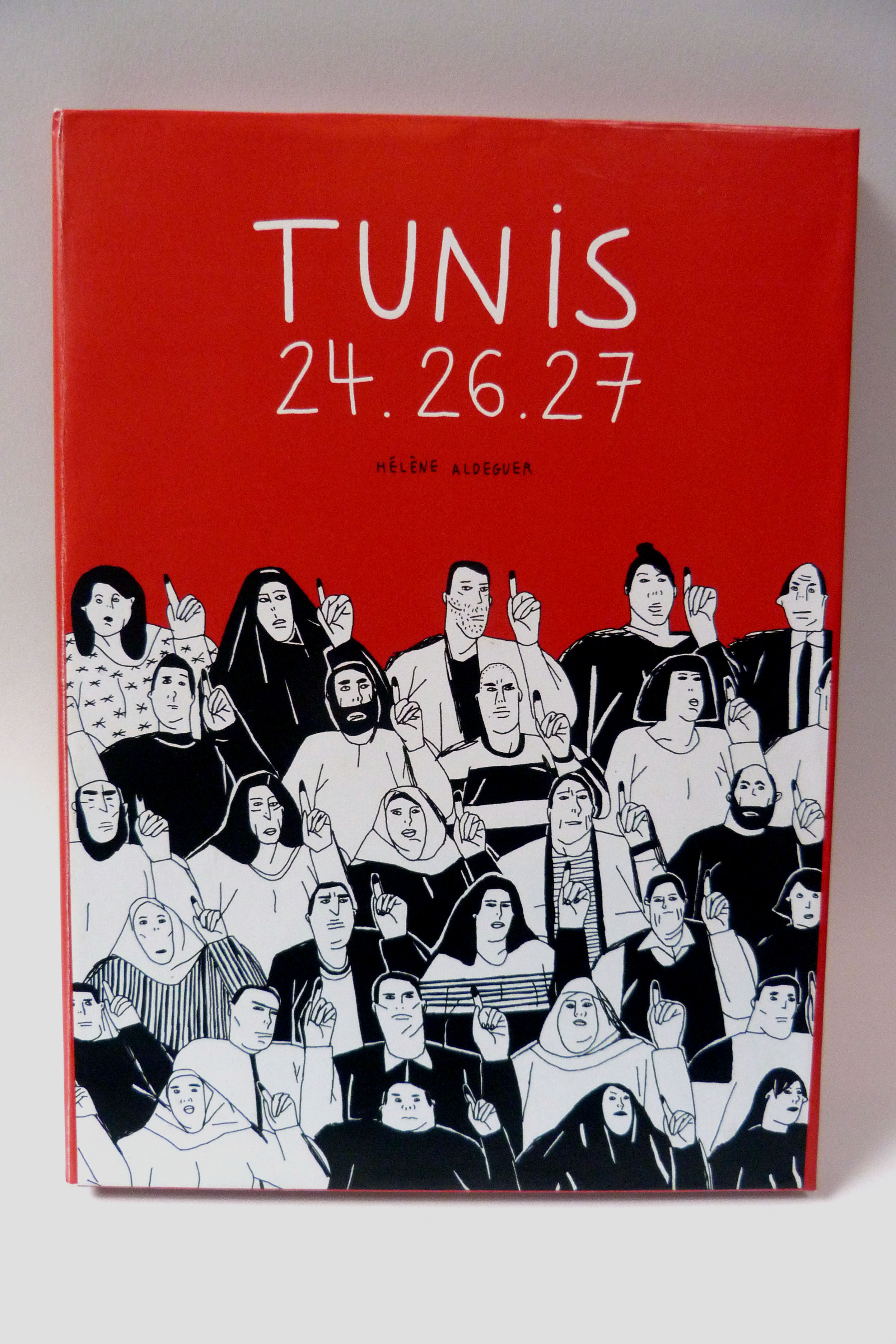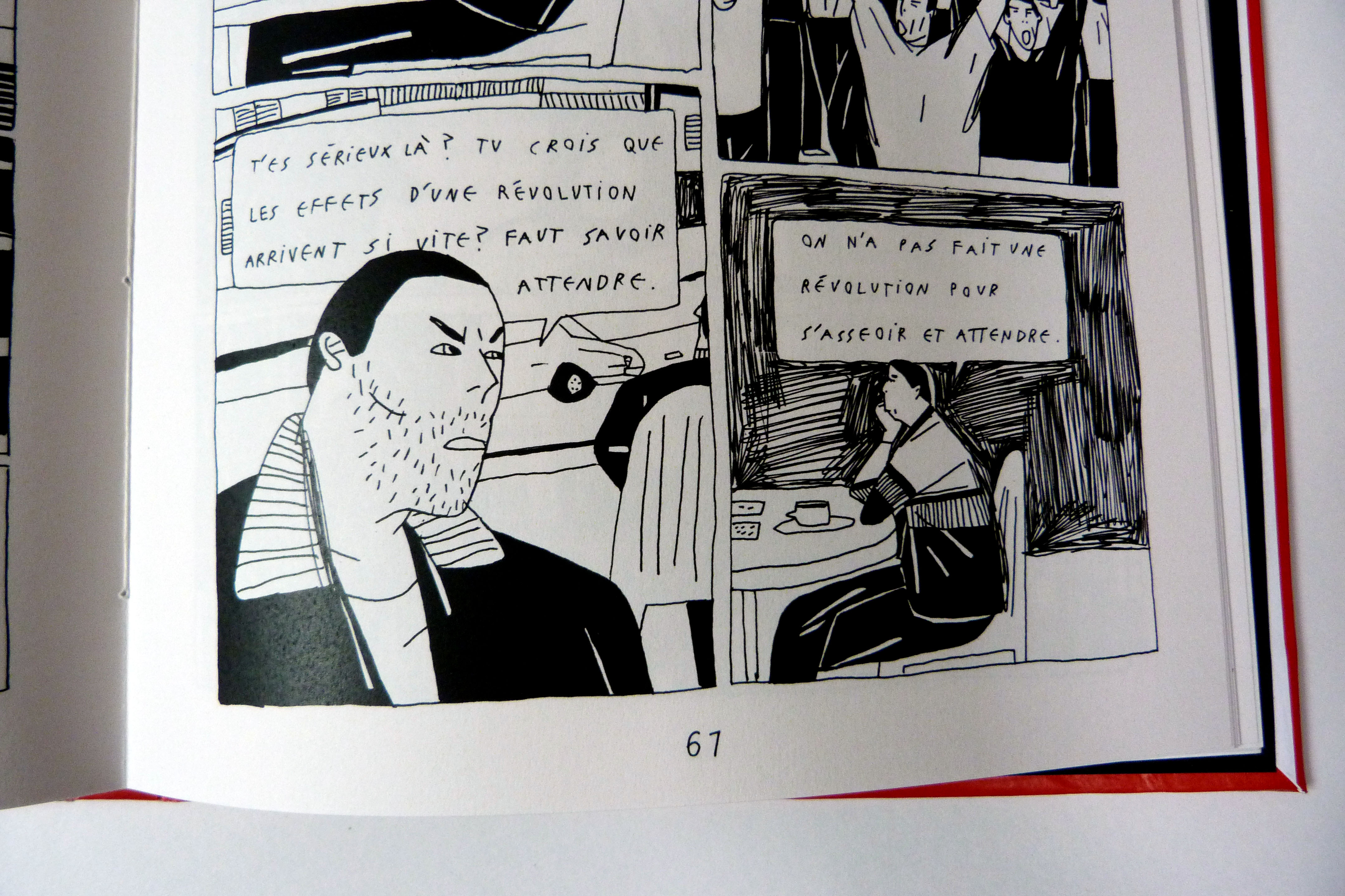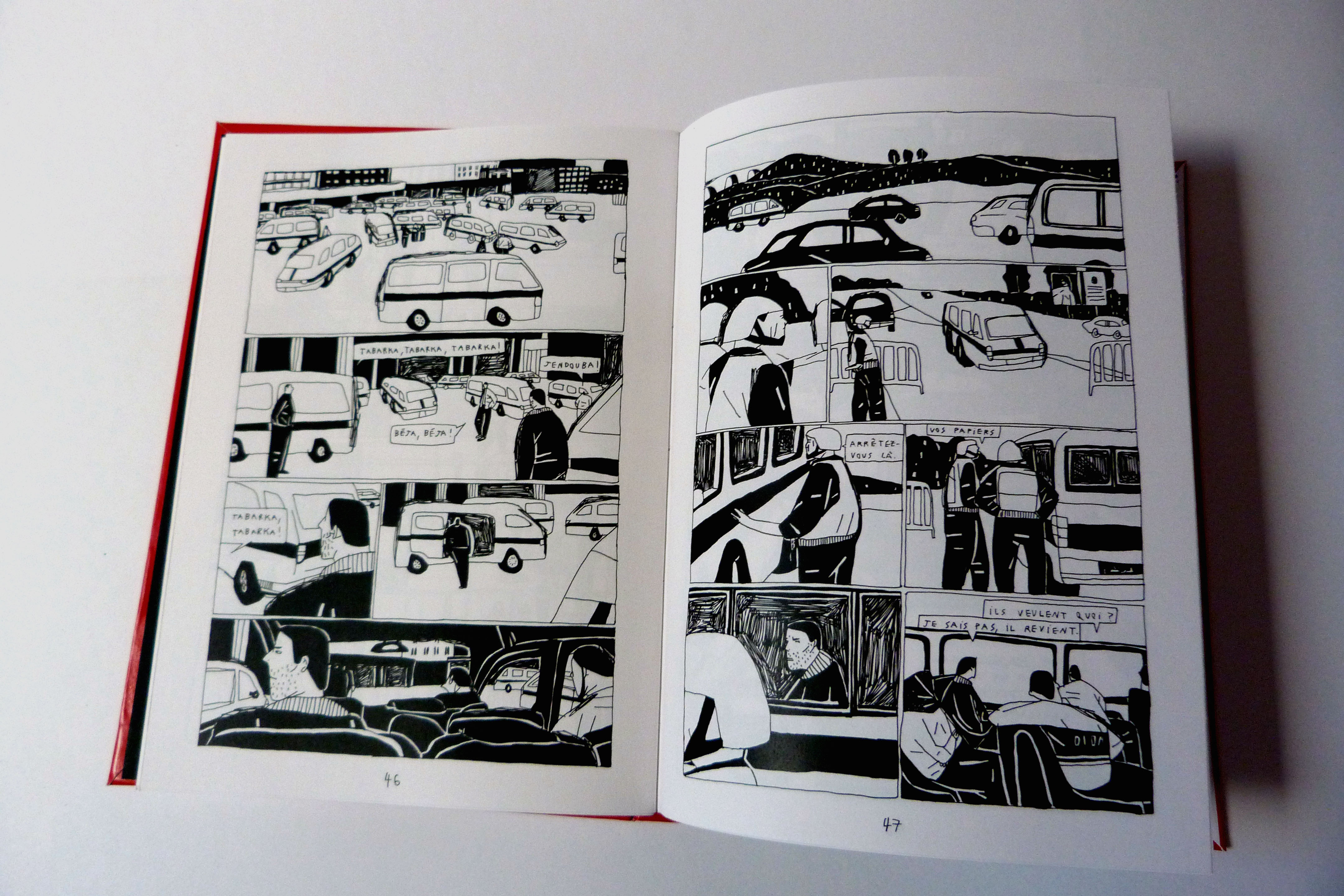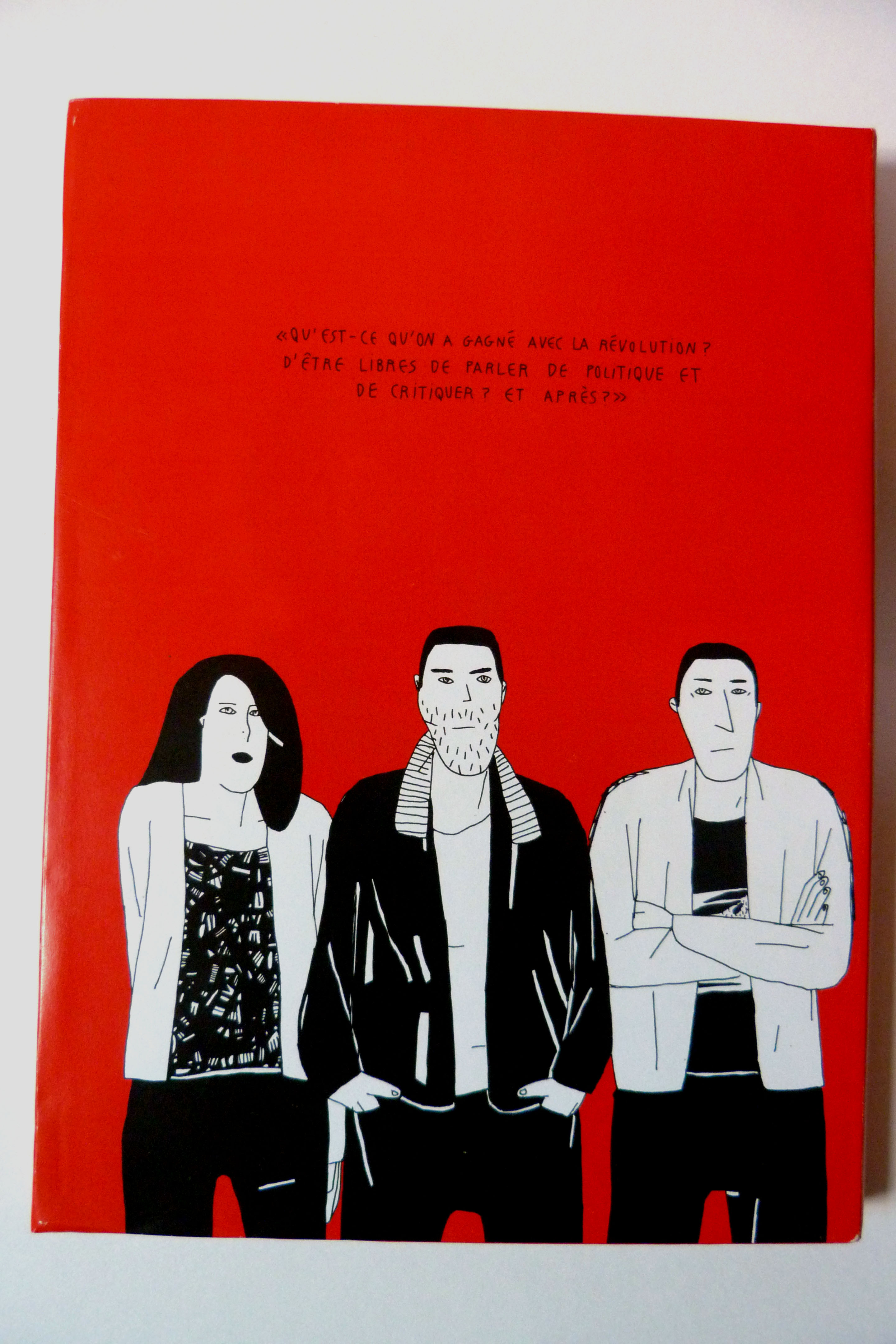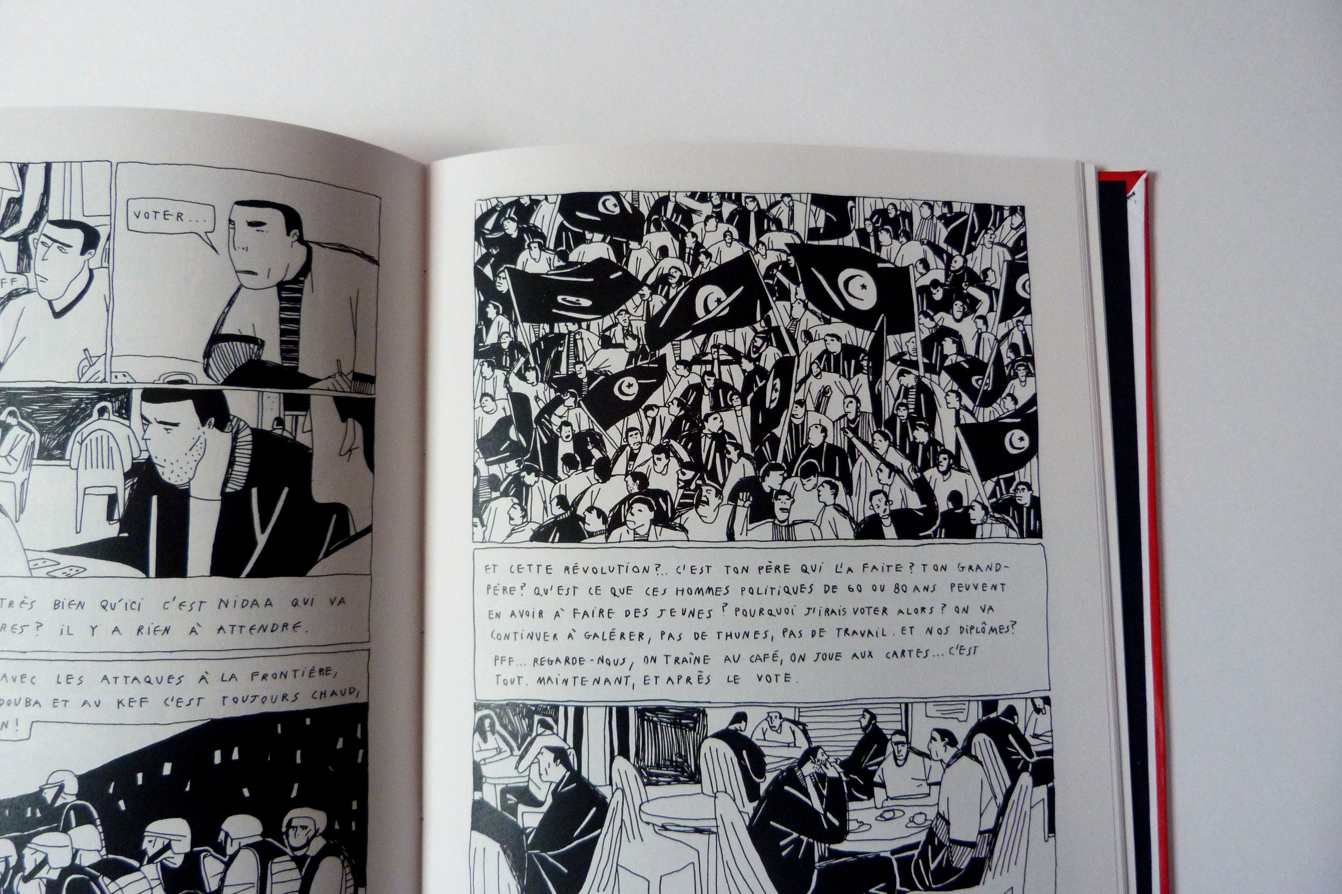 Il y a un an j’ai passé deux mois à Tunis avec les journalistes tunisiens de Nawaat. Je suis ensuite retournée fin octobre à Tunis et à Tabarka (une ville côtière à la frontière algérienne) pour vivre de près les élections législatives, avec des jeunes qui votent. A partir de cette expérience, et autour de trois jours (le 24 octobre, jour d’une attaque dans la banlieue, le 26 octobre jour du vote et le 27 octobre jour des résultats), j’ai recréé cette histoire ainsi que les personnages. Ces dates forment les trois chapitres de la bande dessinée : ils sont ponctués par des illustrations pleine page qui appuient les questionnements mis en place dans le récit. Les enjeux évoqués sont (parmi d’autres) le besoin de sécurité, le risque d’un retour des lois liberticides, la bipolarité politique, le clivage nord/sud, la médiatisation de ces enjeux… et surtout le désenchantement de la jeunesse tunisienne.