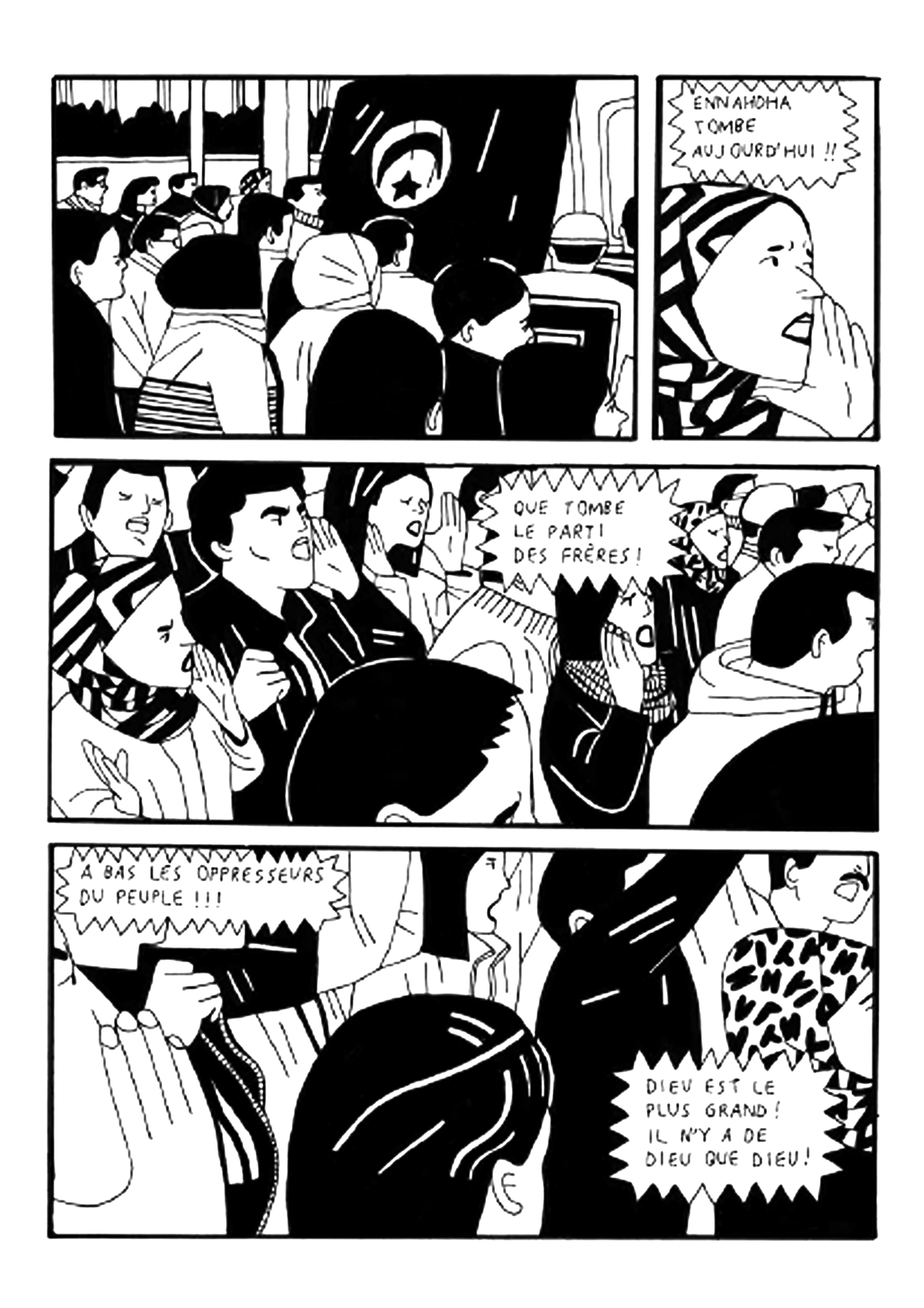 À l’automne, les Tunisiens sont appelés aux urnes pour les premières élections libres de la Tunisie et élisent l’Assemblée, avec une forte majorité pour Ennahdha, parti islamiste. En décembre, l’Assemblée, chargée de rédiger une nouvelle Constitution dans un délai d’un an, élit l’ancien opposant Moncef Marzouki à la présidence. Les partis politiques se multiplient, de nombreuses associations se forment, de nouveaux médias sont créés : la société civile est en ébullition.